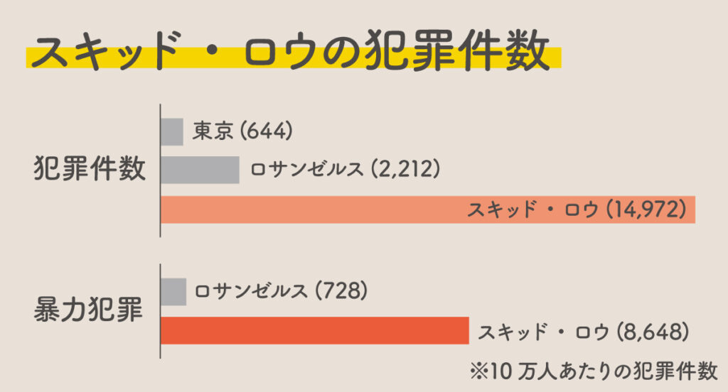 リトル・トーキョーの南側にSkid Row(スキッド・ロウ)と呼ばれるエリアがあります。ホームレスが多く、麻薬中毒者も多いエリアとされています。リトル・トーキョーの他にも、グランド・セントラル・マーケットなどにも非常に近いので、誤って立ち入らないようにしたいエリアです。他の危険エリアに比べてエリアが狭い割には、犯罪件数が非常に多いので、十分に注意しましょう