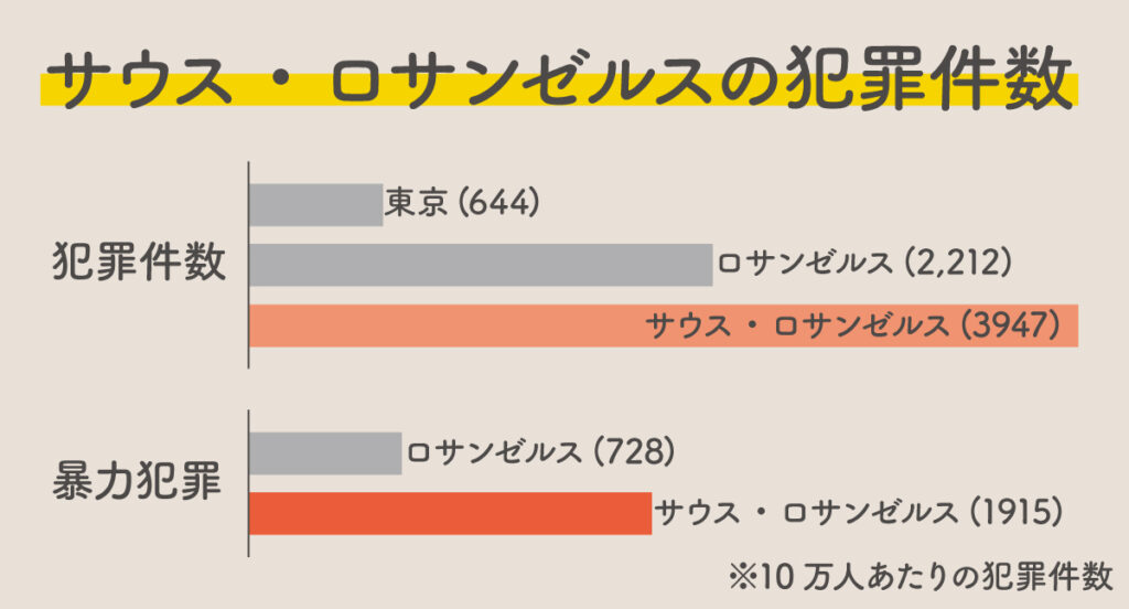 アメリカは日本より治安が悪いことは有名な話です。それを裏付ける証拠として殺人発生率を調べてみると、10万人あたりの殺人事件は、日本0.36件に対してアメリカは5.0件だそうです(出典)。それに加えてロサンゼルスの殺人発生率はアメリカ平均を超える9.9件になります(出典)。殺人以外にも、強盗やレイプなどの凶悪犯罪が多いようです。今回の記事では、ロサンゼルスの危険なエリアを紹介すると共に、危険なエリアを見分ける方法を紹介します。