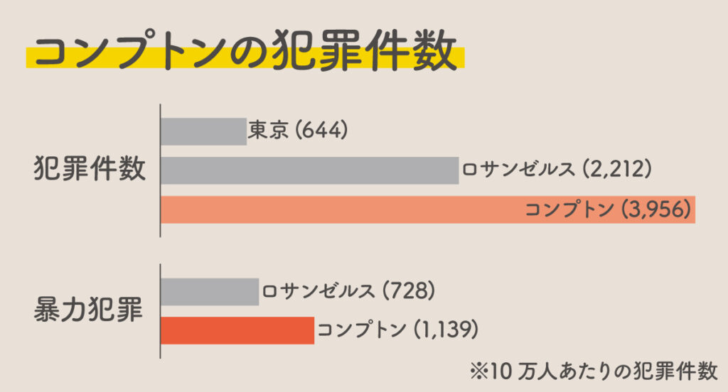 アメリカの有名なラッパー、「ケンドリック・ラマー」など数々の著名人の出身地でも知られているコンプトン。ここは貧困層が多く、犯罪率も高いエリアだと知られています。ギャングの抗争もあるようで、全米でトップクラスの治安悪い場所になっています。昼間でも決して近づかない方が良いエリアです