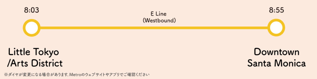 宿泊先であるミヤコホテル最寄りの「Little Tokyo / Arts District」駅から「Downtown Santa Monica」駅は乗換えなしです。所要時間は50分ほどかかるので、くれぐれも寝ないようにしましょう。