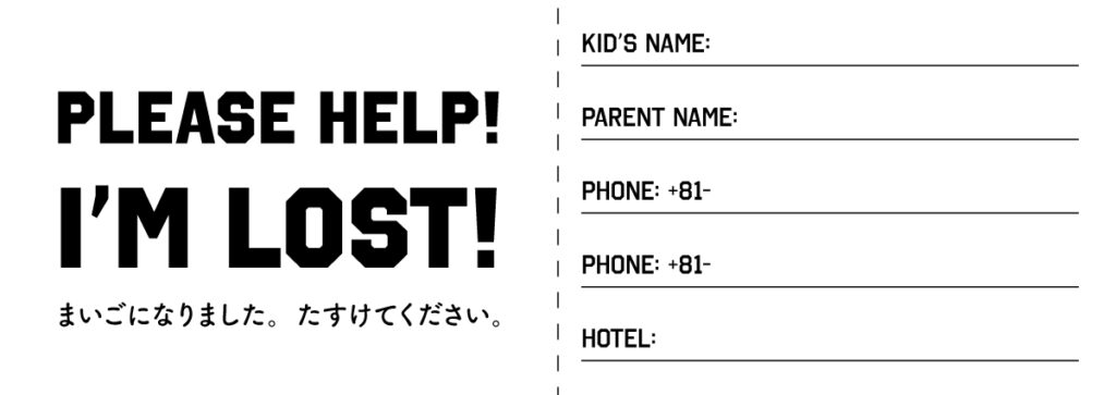 今までデジタル機器を紹介してきましたが、デジタル装備をしていても準備しておきたいのが「迷子カード」。紙とペンがあれば十分。英語でメッセージを書き、子どもの名前、親の名前、電話番号、ホテル名などを書いておきます。そして、その紙を子どもに渡しておき、「迷子になった時に使うこと」を伝えておきます。
